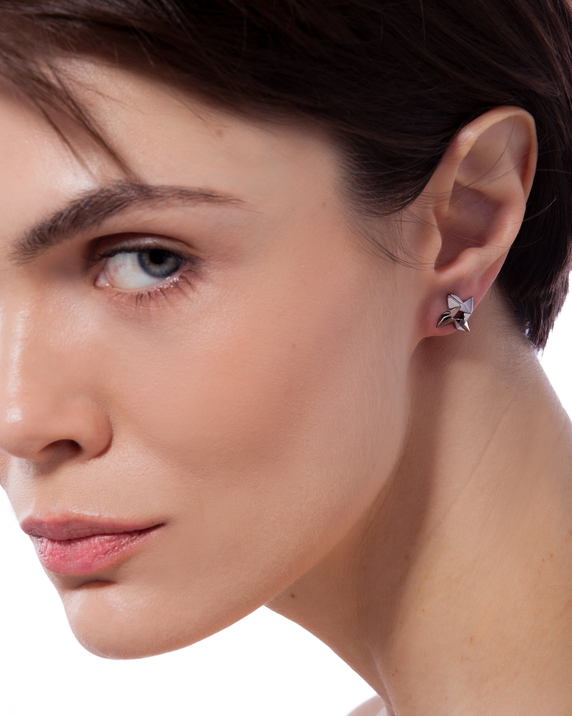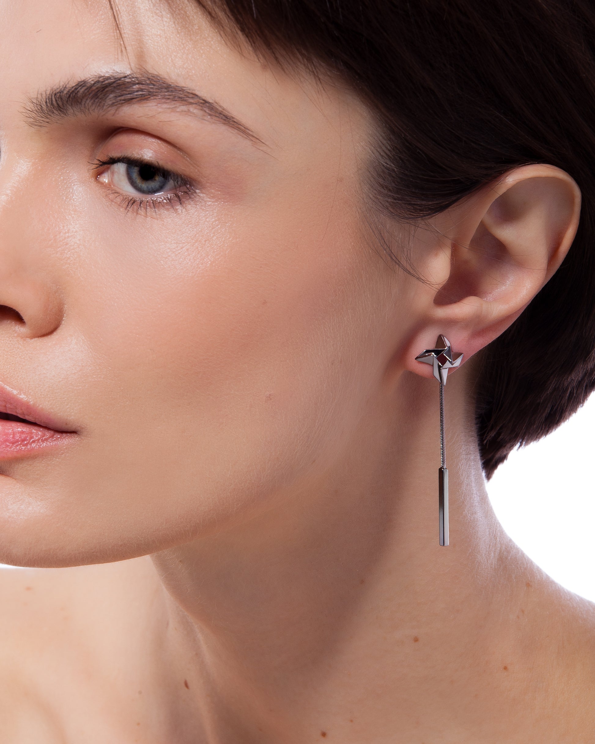 Delicate and multifunctional, the Kaze P Earring by Maria Dolores brings the charm of the pinwheel in a delicate version and full of possibilities. The earring, rhodium plated, works the design with faceted surfaces and angles reminiscent of origami. The highlight is the removable pendant, formed by a thin rat tail mesh chain with a metal tip which allows you to create different ways of wearing it: short, long or asymmetrical, with one side with the chain and the other without. One2-in-1 earrings, versatile and expressive, ideal for those who like to play with styling and compose other pieces from the Kaze line with lightness and personality.