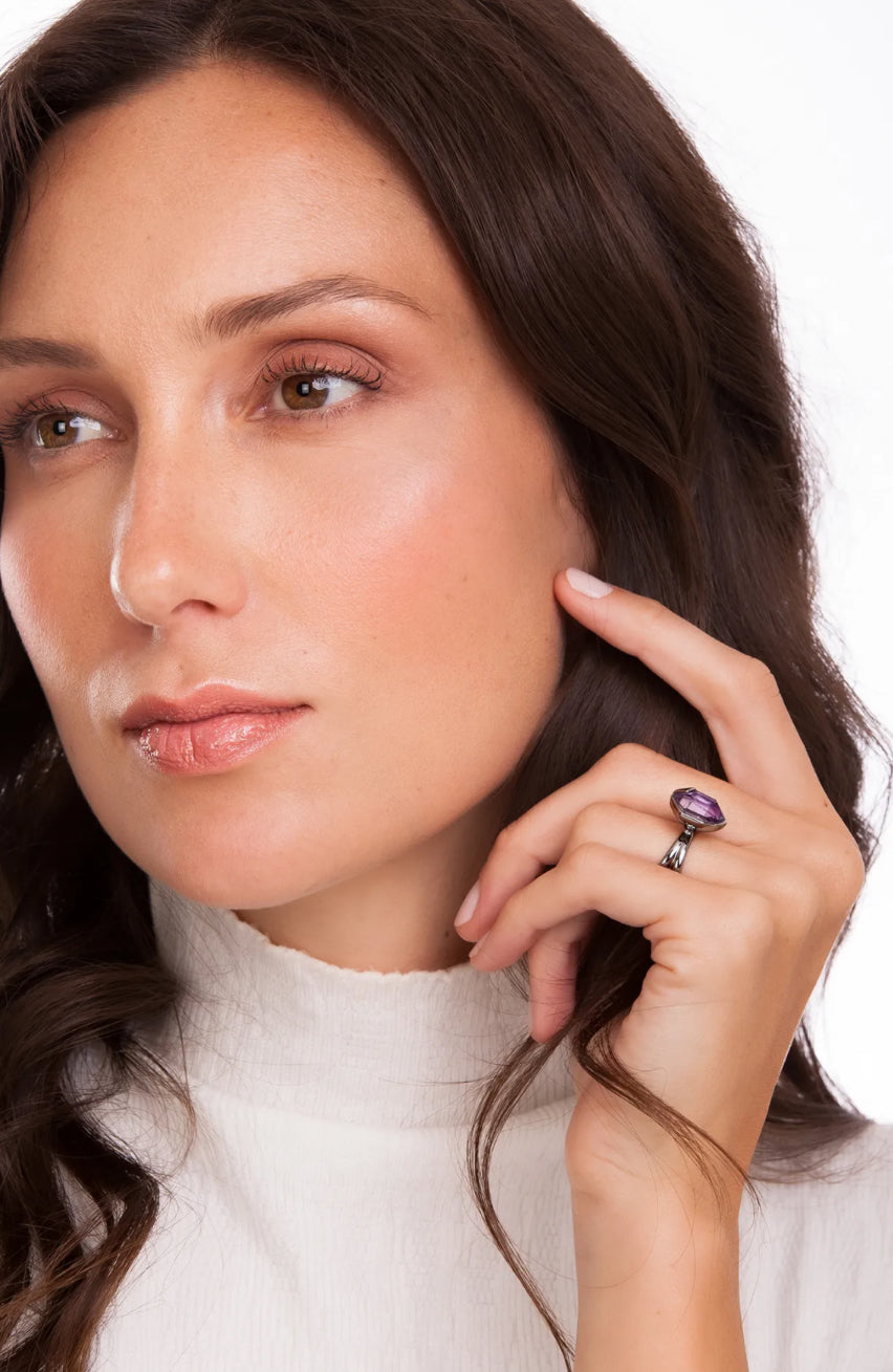 The Ludic Maria Dolores Ring is a small ring, plated with black rhodium, in the solitary model with double rim to provide more comfort and prevent the ring from rotating on the finger. The ring has an upper detail composed of an irregularly shaped Amethyst natural stone, faceted cut, and a small metal detail as if it were a base that purposely exceeds one of the cuts in the corner of the stone, to give an extra touch of brightness. A delicate and timeless ring, perfect for those who love a mix of basic and classic accessories, and it is also possible to use two rings of the same model, but with different stones, creating a charming combination that guarantees a pinch of color and joy in your composition.